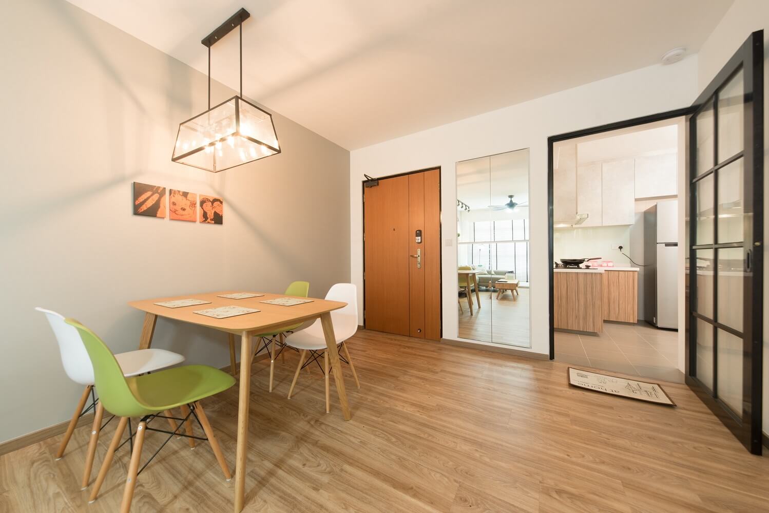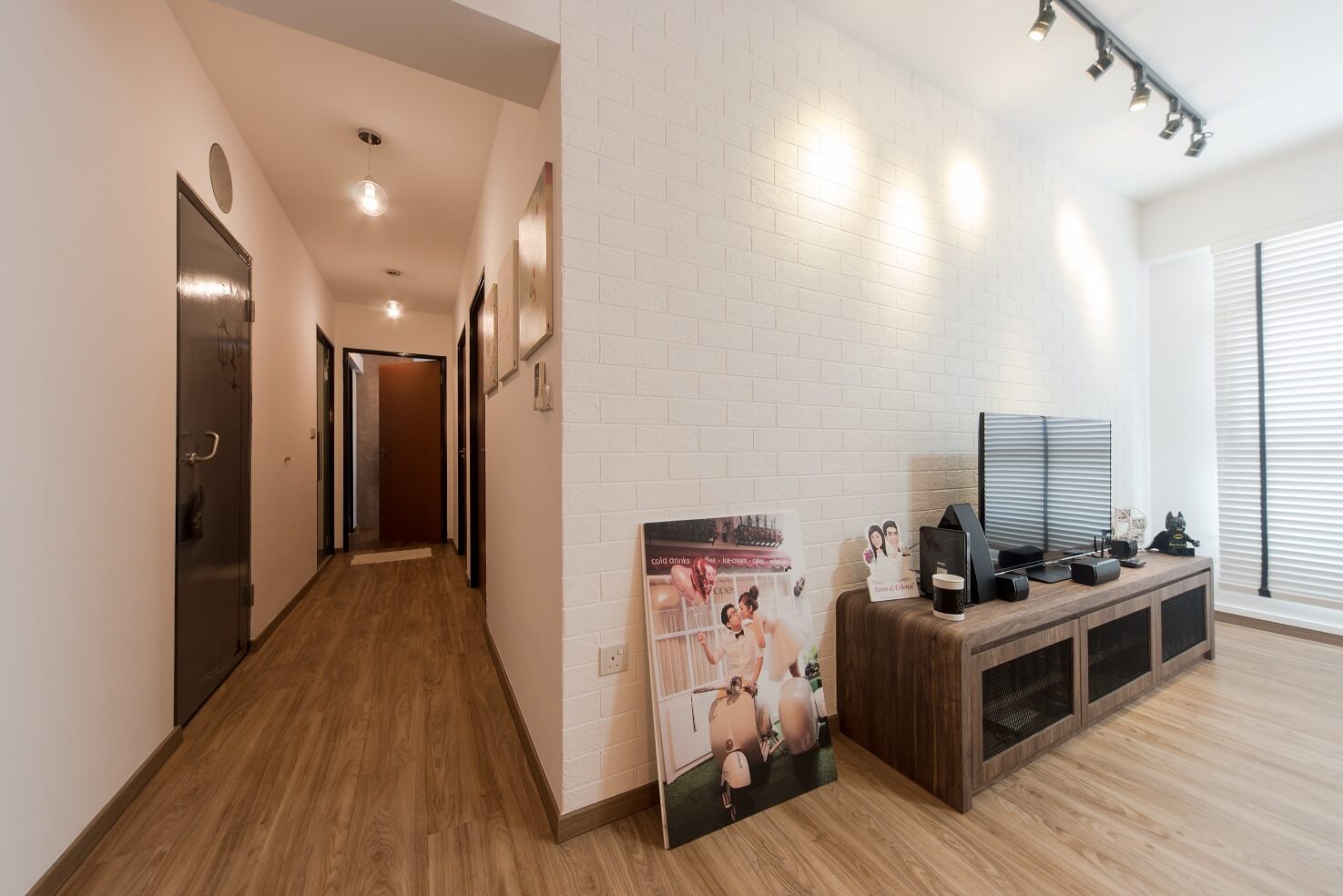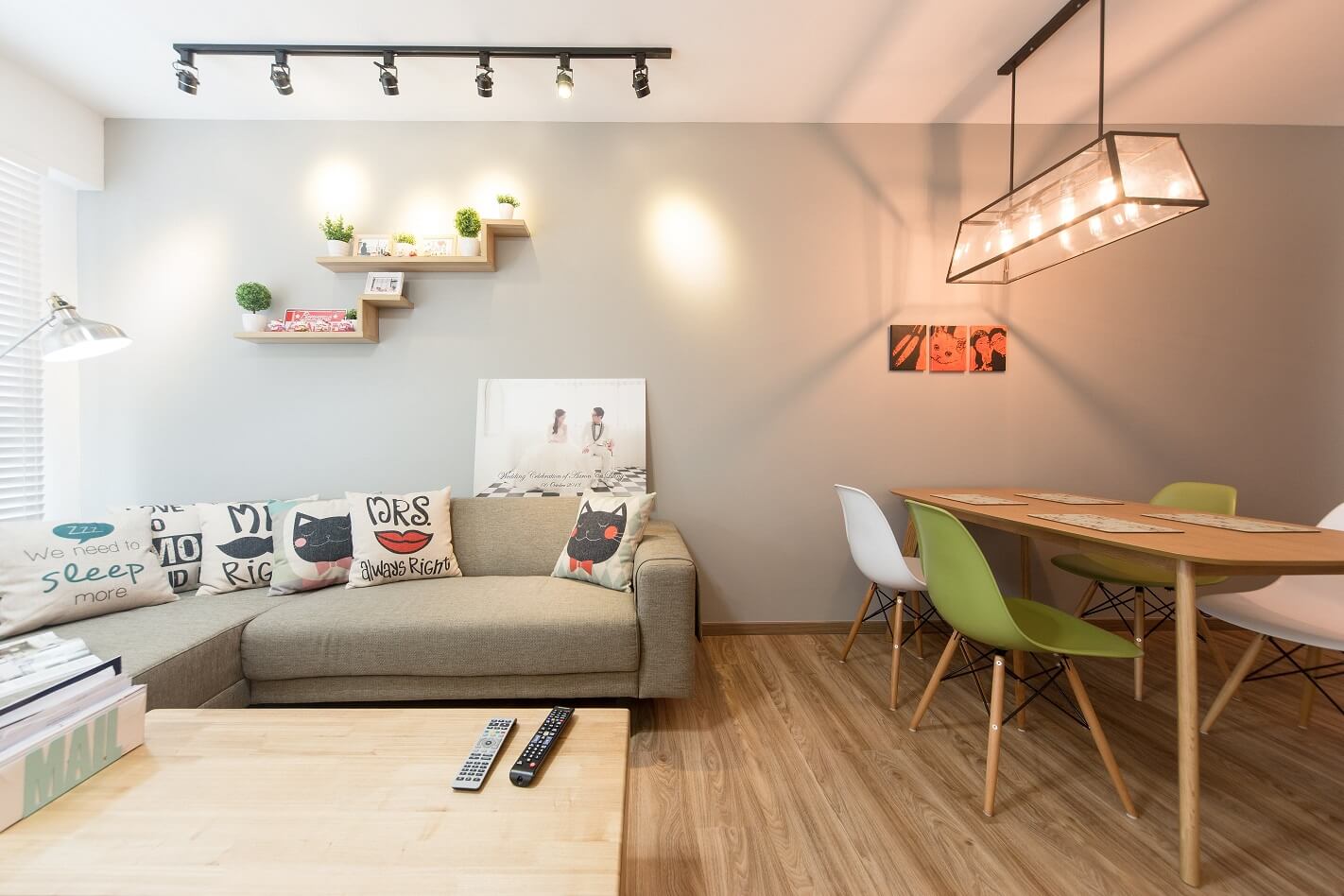 Ruangan bertema scandinavian yang karakternya diperkuat dengan pencahayaan yang tepat